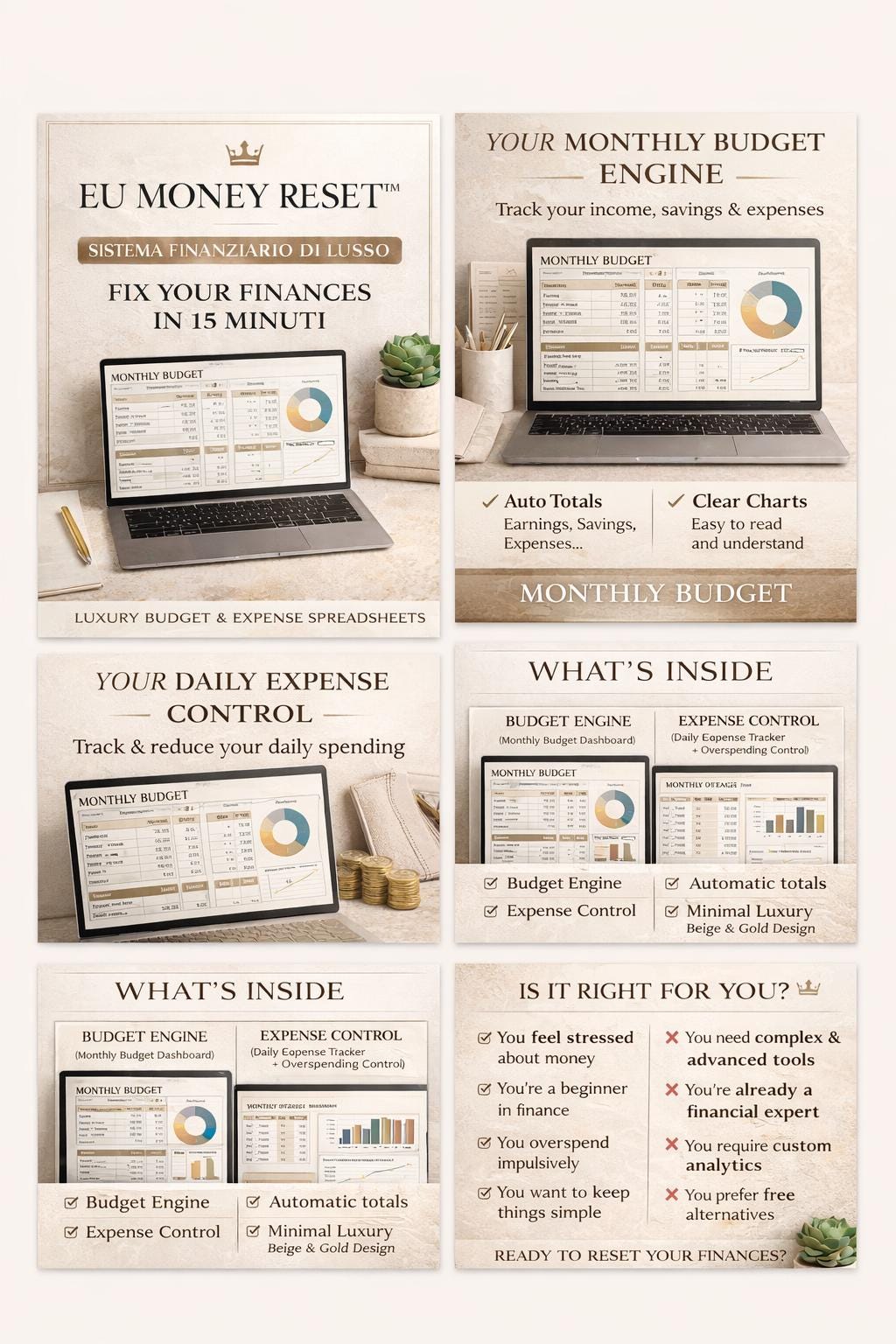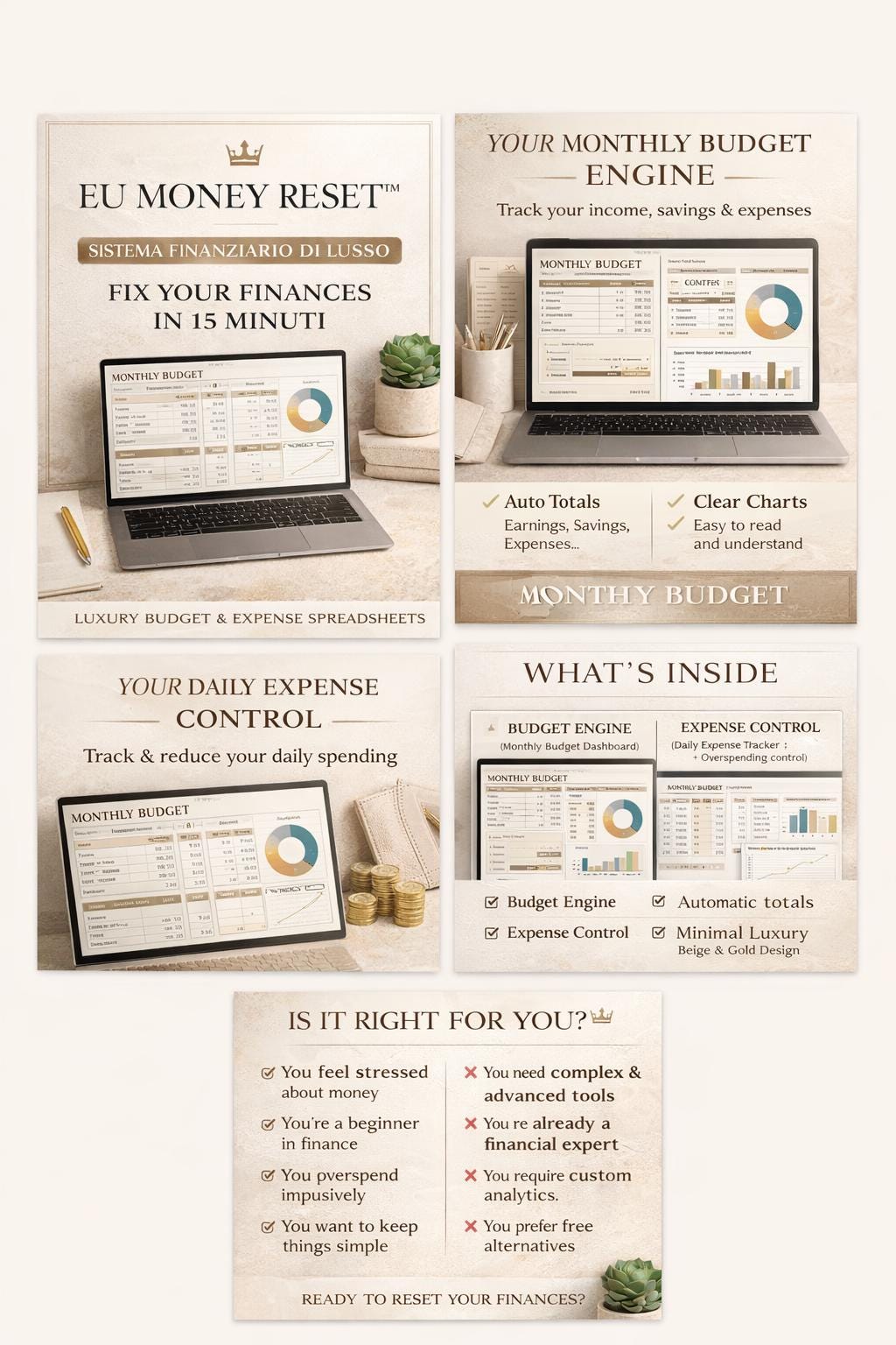 1. Luxury Budget & Expense Tracker | Personal Finance Reset System | Beige Gold Financial Planner 2. Money Reset System™ | Luxury Budget & Expense Tracker | Fix Your Finances in 15 Minutes 3. Beige Gold Budget Planner + Expense Tracker | Minimal Luxury Personal Finance System Description: Fix your finances in 15 minutes a month with a minimal, elegant and powerful money control system. What's inside:- Budget Engine Dashboard- Expense Control Tracker- Automatic charts and totals Why you'll love it: • Minimal luxury design • Beginner friendly • Printable and digital use