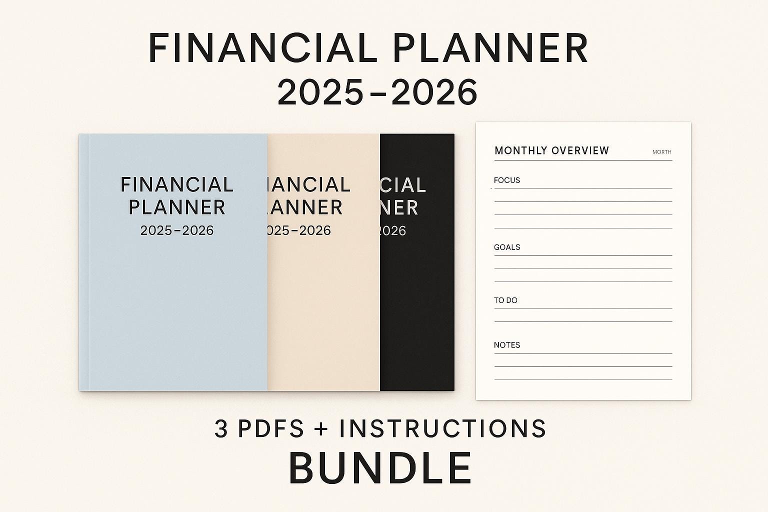 This complete financial planner helps you track your money, build better habits, and plan your financial future with clarity and simplicity. You will receive 3 complete planners in different styles: • Blue — Clean and modern • Beige — Warm and elegant • Black — Sharp and minimal (bold outlines) WHAT’S INCLUDED A downloadable ZIP containing: • 3 PDF planners (Blue, Beige, Black) •