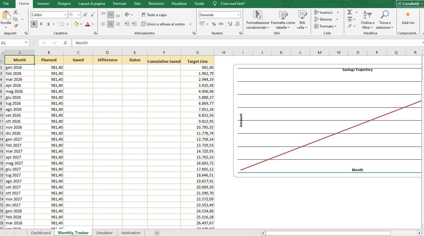 Features: • Automatic monthly saving goal calculation • Visual dashboard with progress bar and charts • Monthly tracker with Ahead/Behind status • Cumulative savings vs target line • What if simulator • Motivation printable page Included sheets: • Dashboard • Monthly Tracker • Simulator • Motivation File details: • Excel (.xlsx) • Editable • Works on Windows & Mac • No macros • Instant download