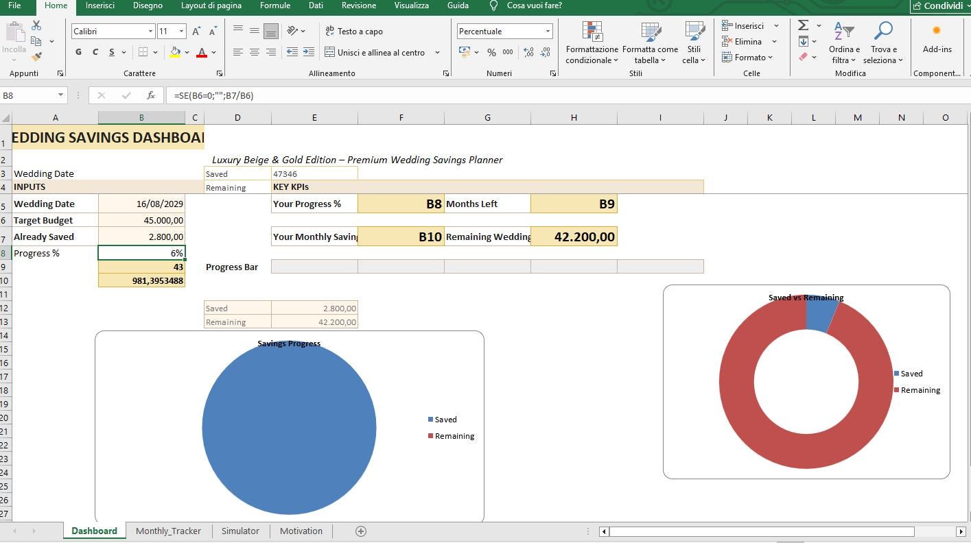 This Wedding Savings Planner is a luxury beige & gold Excel system designed to help couples plan, track and achieve their wedding saving goals month by month — without stress or debt.